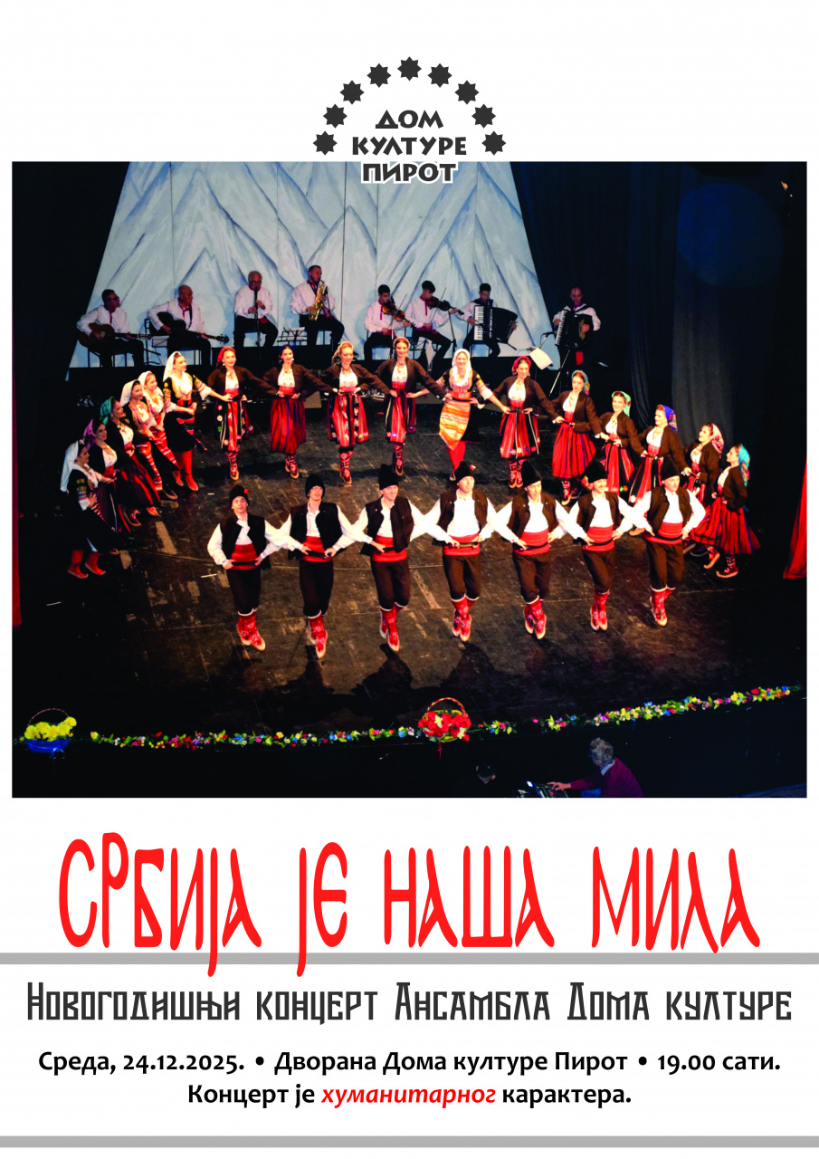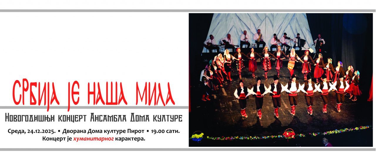 Новогодишњи концерт Ансамбла Дома културе • Среда, 24.12.2025. • Нова дворана Дома културе Пирот • 19.00 сати.